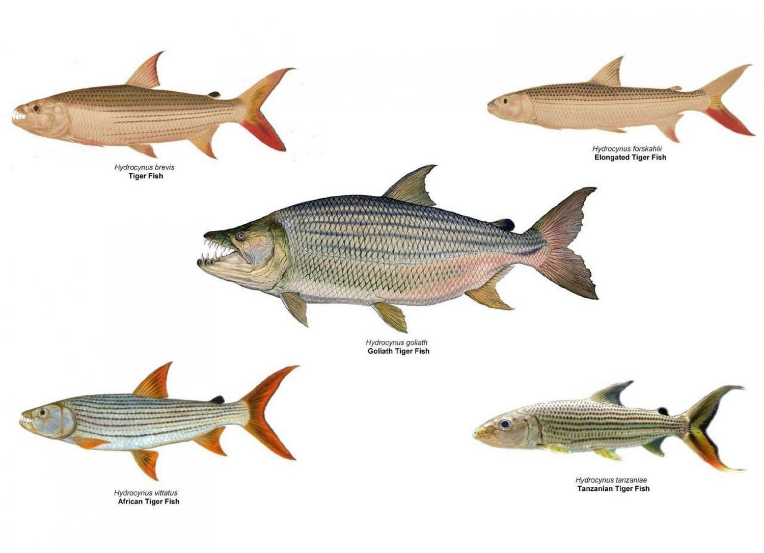 (Hydrocynus Cuvier, 1816) Род Гидроцинусы, Гидроцины, Тигровые рыбы, Африканские тигровые рыбы, Genus Hydrocynus Cuvier, 1816 (Tiger fishes, African tigerfishes, Hydrocynes) 6 видов